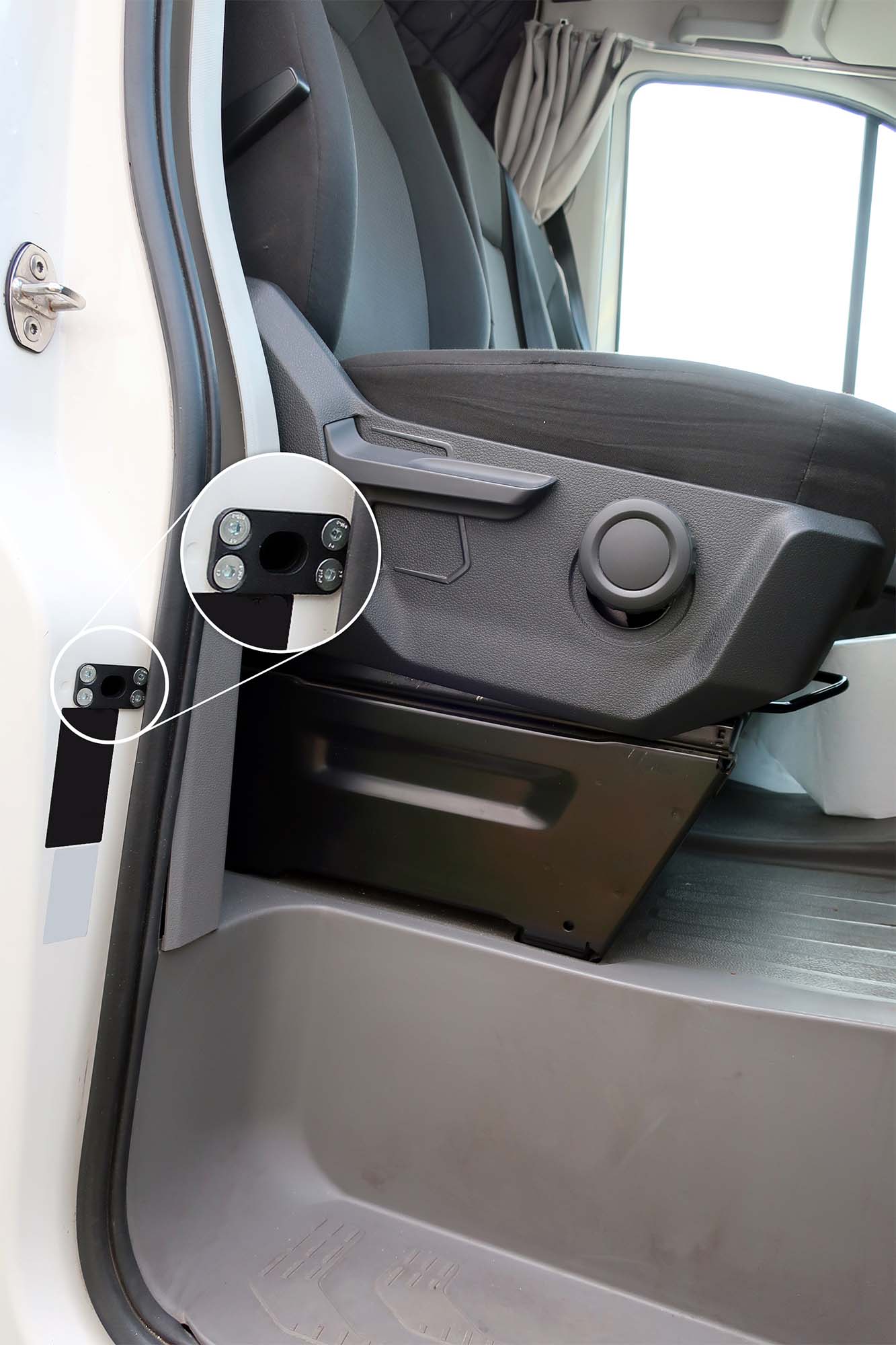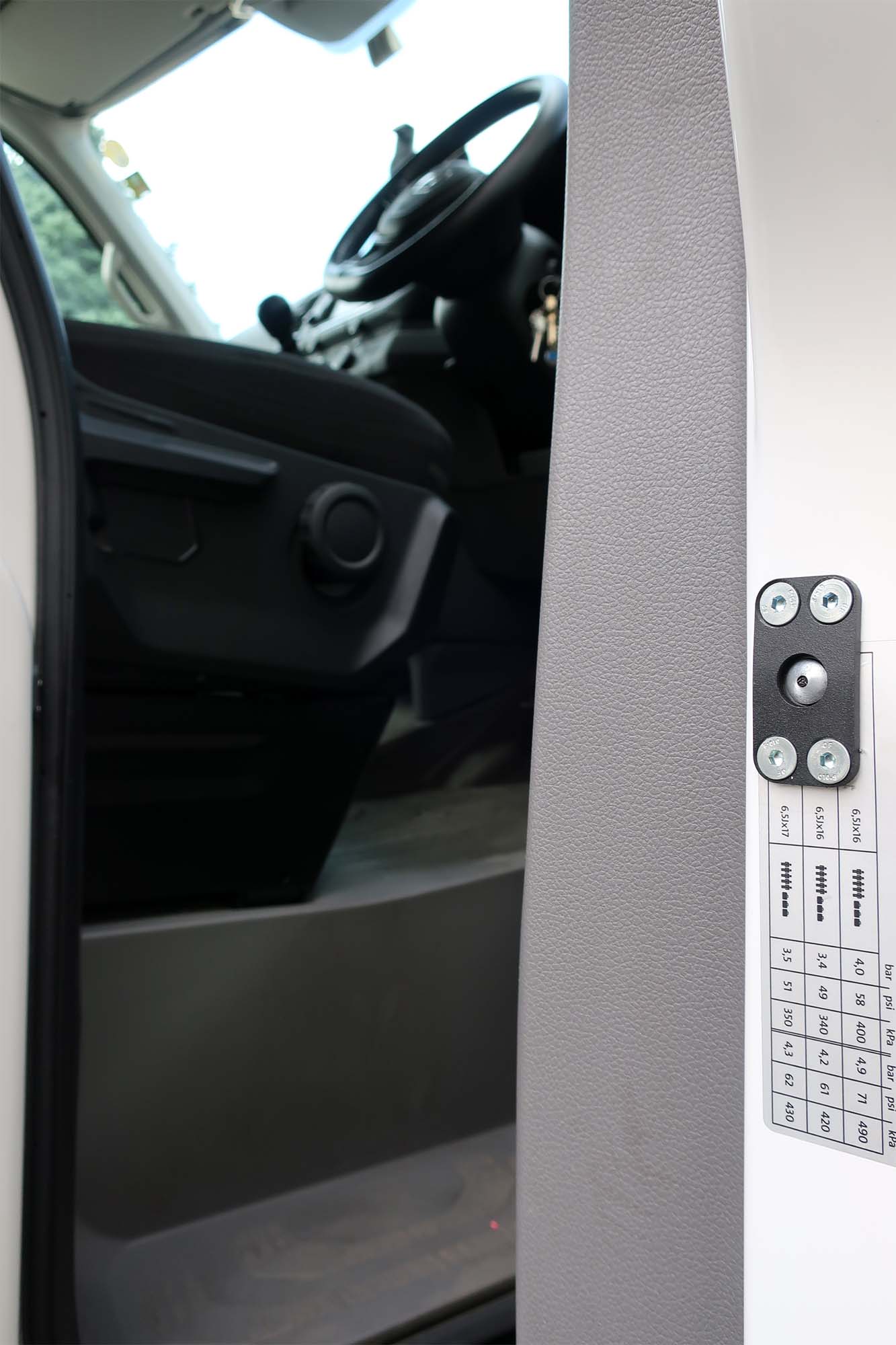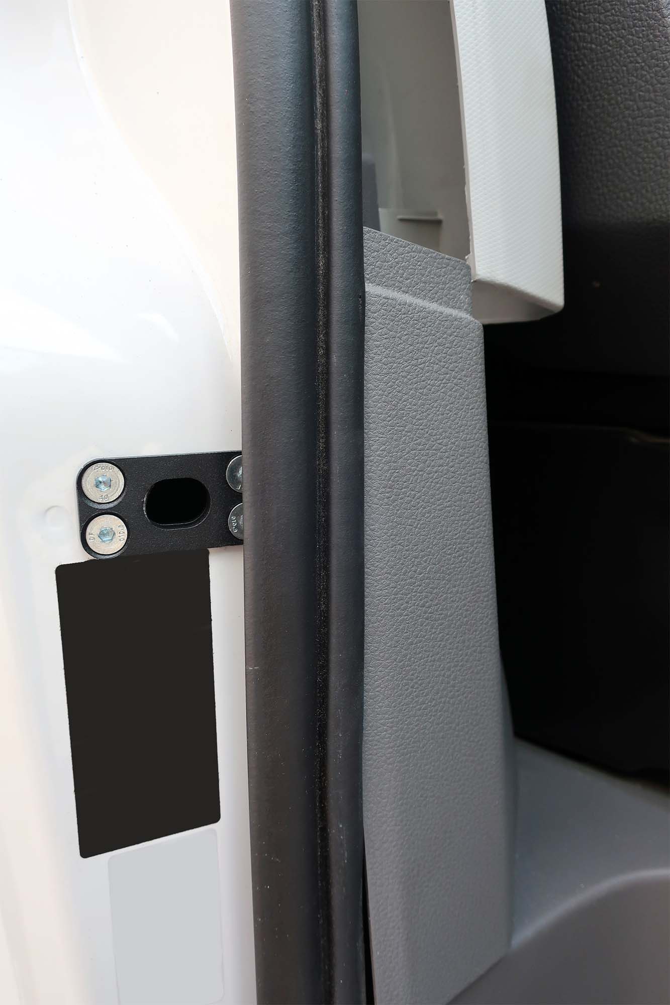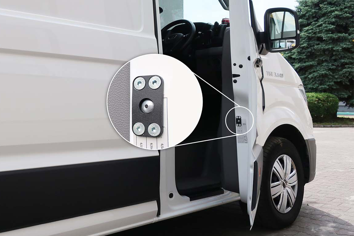 Když je zámek zavřený, šroub se vysune ze dveří a zasune se do speciálního pouzdra, které je umístěné v karoserii. Šrouby jsou vyrobeny ze speciální oceli, která má takovou pevnost, aby řidič měl jistotu – do kabiny se nikdo nedostane. Jakmile zloděj překoná sériové zámky, narazí na náš zamykací mechanismus, který účinně zajistí kabinu proti vniknutí.